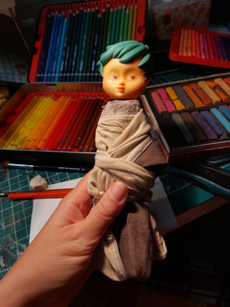 The technique I mainly used is called doll customizing. The principle is to turn manufactured, mass-produced dolls, into unique pieces of art by modifying them from head to toes, giving them new features and clothes. This practice involves a whole range of skills, from painting to modeling and sewing, which makes every custom a fun new adventure. The feelings attached to old toys that have been abandoned, the nostalgia that may arise when looking at their shape, all of this resonates deeply in my practice.
