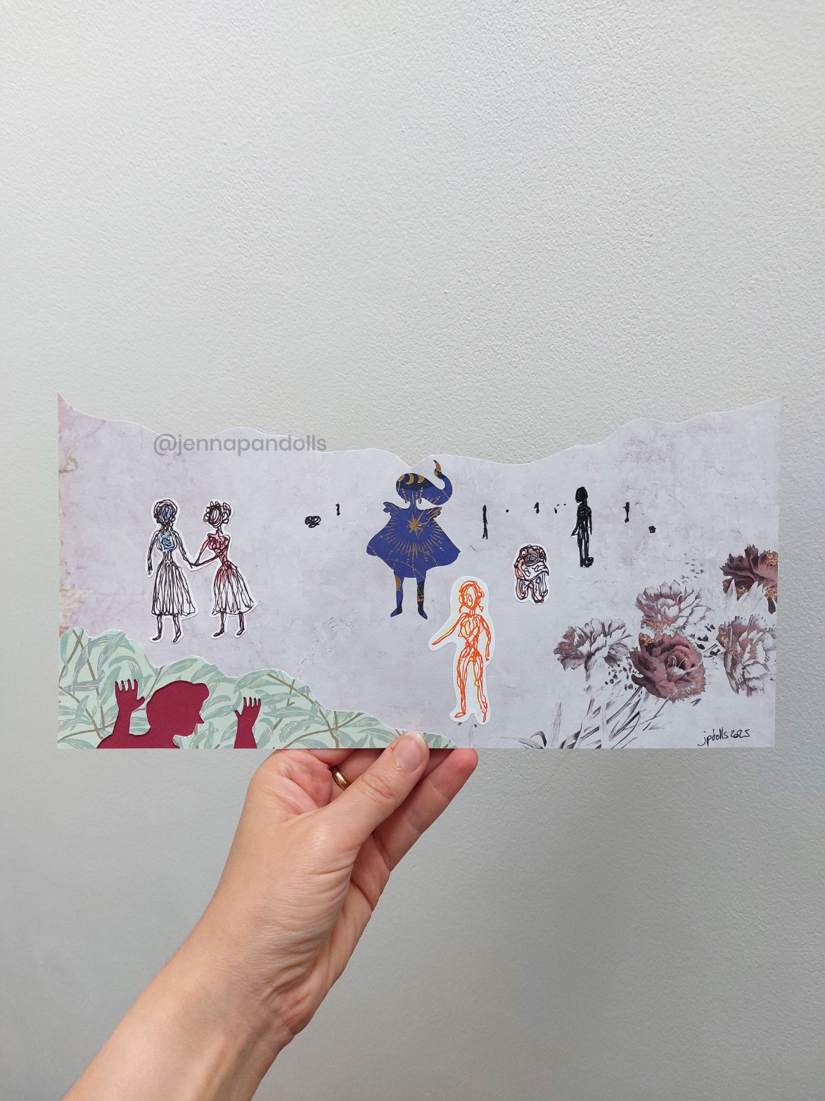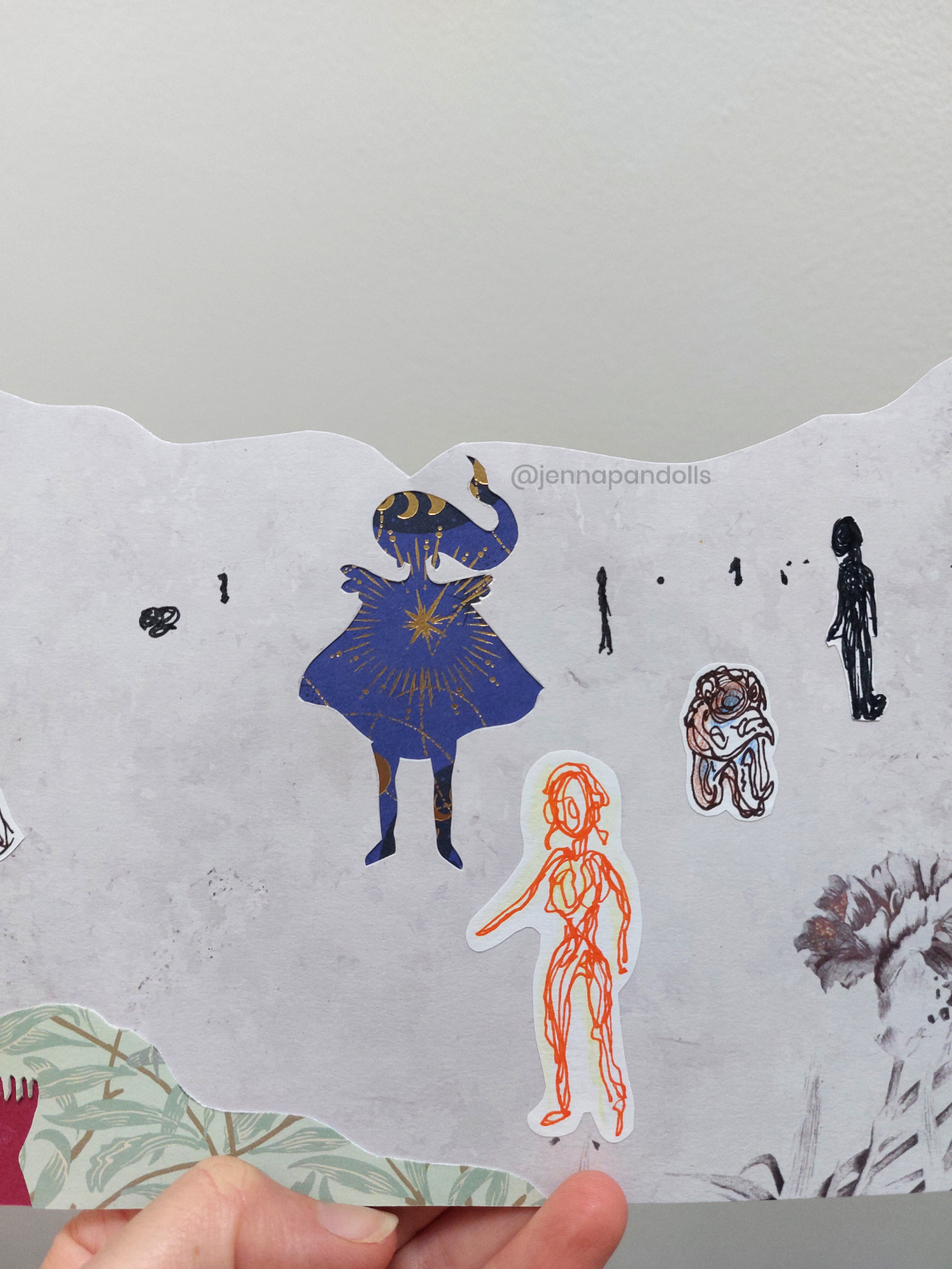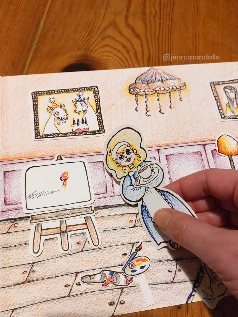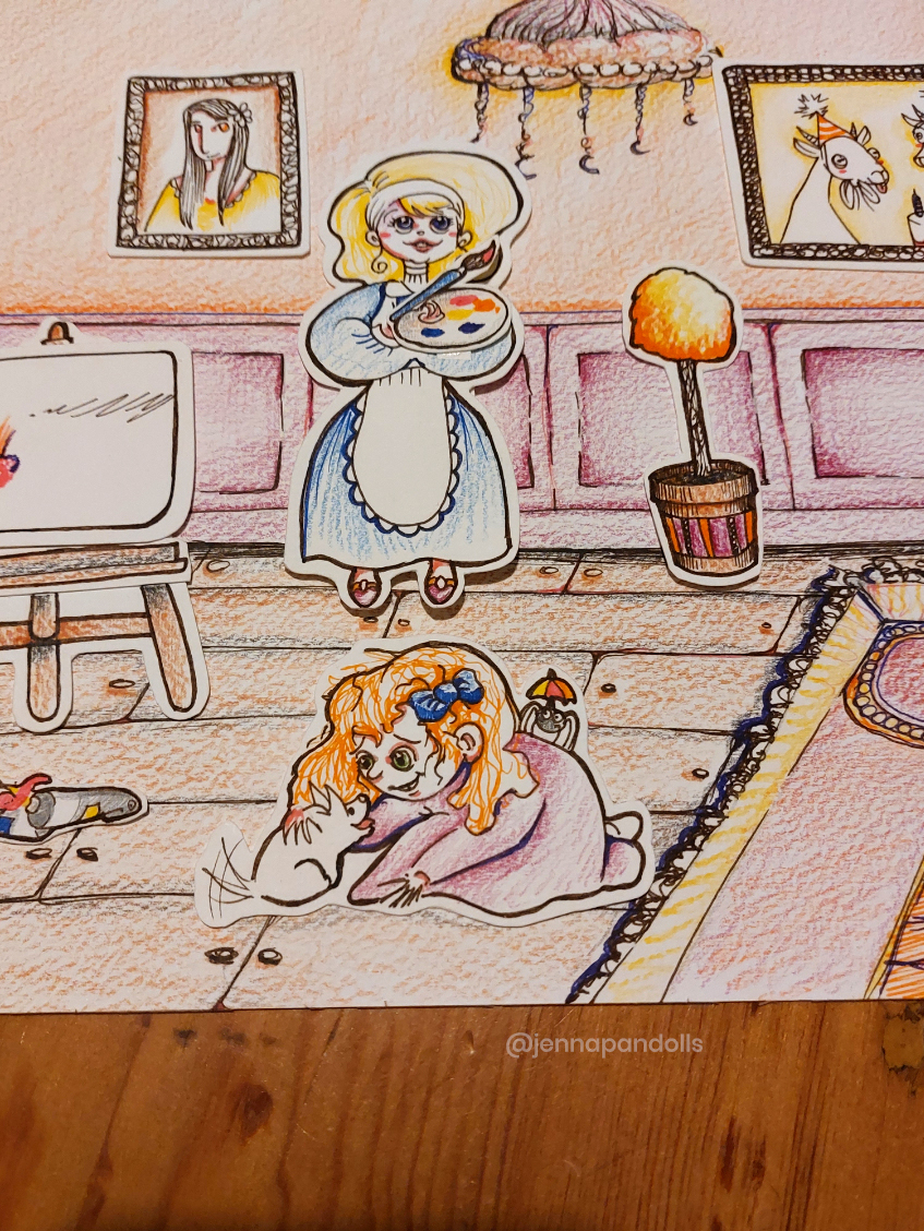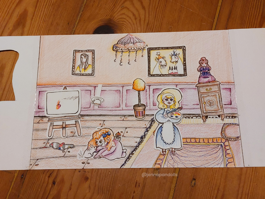 Day (website background), 2025Paper collage, stylized with felt tips, pencils and acrylics. Night (website background), 2025Paper collage, stylized with felt tips, pencils and acrylics. Countryside life, 2024Paper doll house with two flaps, two detached characters and several pieces of furniture. Drawn with pencils and coloured felt tips. I have a problem doctor, 2019Drawn by hand with black felt tips, and coloured-in with graphic design software. Chicken Boi, 2021Paper doll articulated with split pins. Painted with watercolours. About 20 cm. Louisa, 2021Paper doll articulated with split pins. Painted with watercolours. About 20 cm. Wanda, 2021Paper doll articulated with split pins. Painted with watercolours. About 20 cm. Sketches and Scenes, 202412 Images Felt tips and pencils. Nothing can keep me warm anymore, 2024What to do now?, 2024Inner struggle, 2024Severe, 2024Powerless, 2024Carrying waves, 2024Conversation, 2024When you're grounded, 2024Flower fairy, 2024Did you really think that?, 2024Through my eyes, 2024 Congratulations, you're an artist!, 2019Black felt tip and pencils. The Archer, 2022Drawn by hand with pencil, and coloured-in with graphic design software. The Artsy Clown, 2020Submitted to Poppen Atelier for her big 500k subscribers collab on her youtube channel. Under the Moon, 2025Paper collage, stylized with felt tips, pencils and acrylics. Under the Moon, 2025 Something there, 2025Paper collage, stylized with felt tips, pencils and acrylics. Sketches and Scenes, 2020-20216 images. Felt tips and watercolour. Regrets, 2020Scenes 1, 2020Esprits, 2021Quest, 2020Scènes 2, 2020 Business Cards2 images. Drawn by hand with black felt tips, and coloured-in with graphic design software. Business cards, 2019 Illustrations for catalogues and websites7 images. Drawn by hand with black felt tips, and coloured-in with graphic design software. Back cover of the catalogue Jenna Pan 2015-2020Ernest le Modeste, 2020Drawings from "Jenna Pan 2015-2020" catalogueTemporary website banner, 2025Website banner part 2, 2019Website banner part 1, 2019
