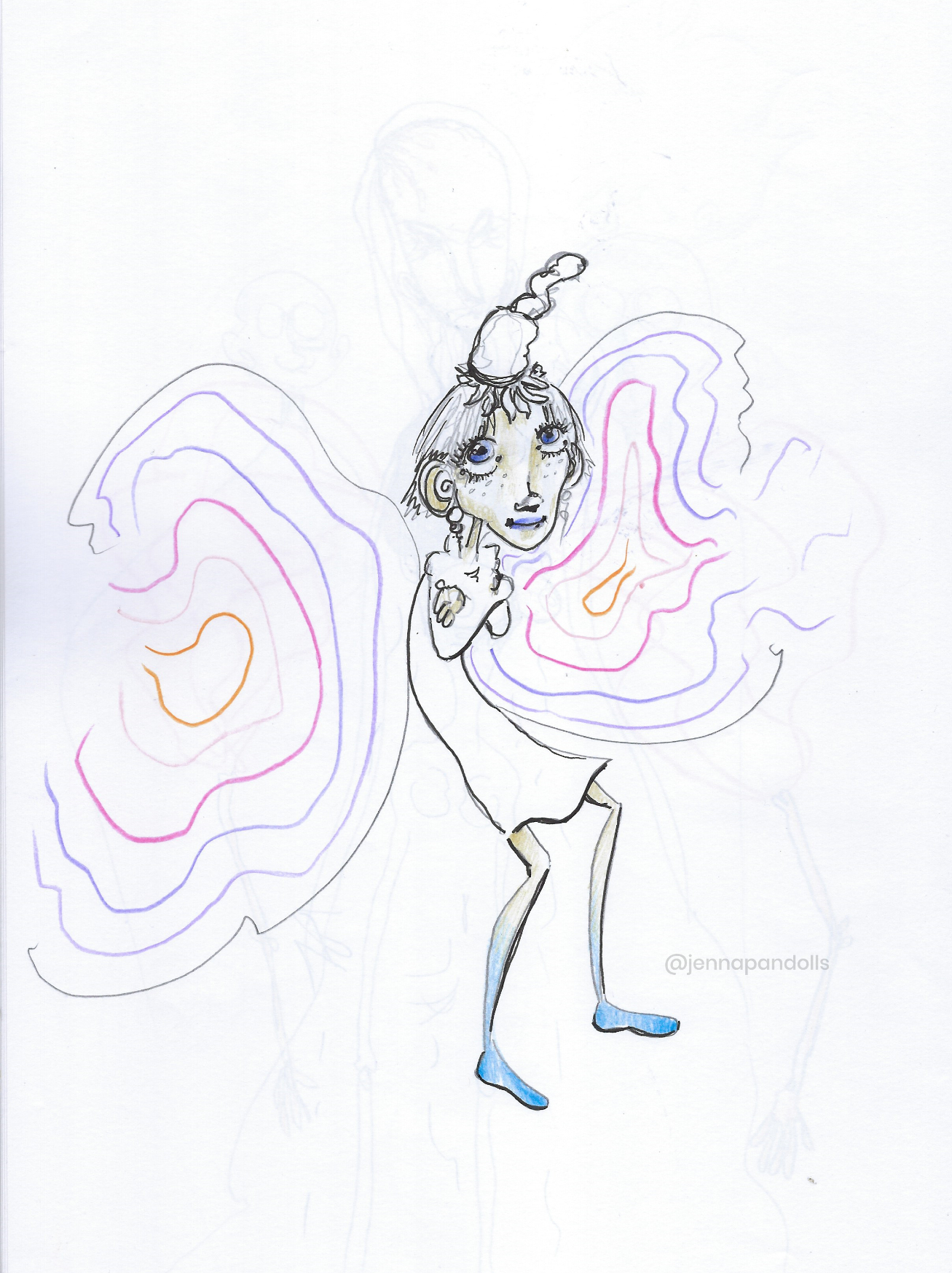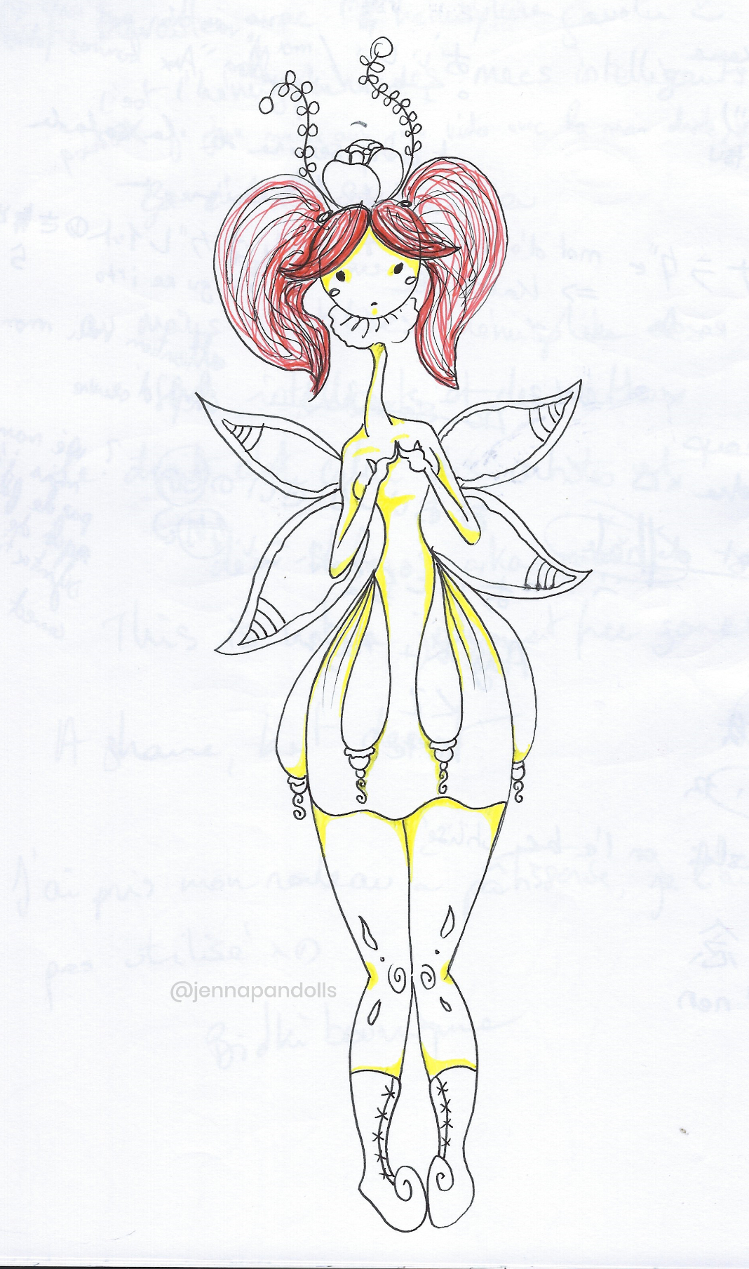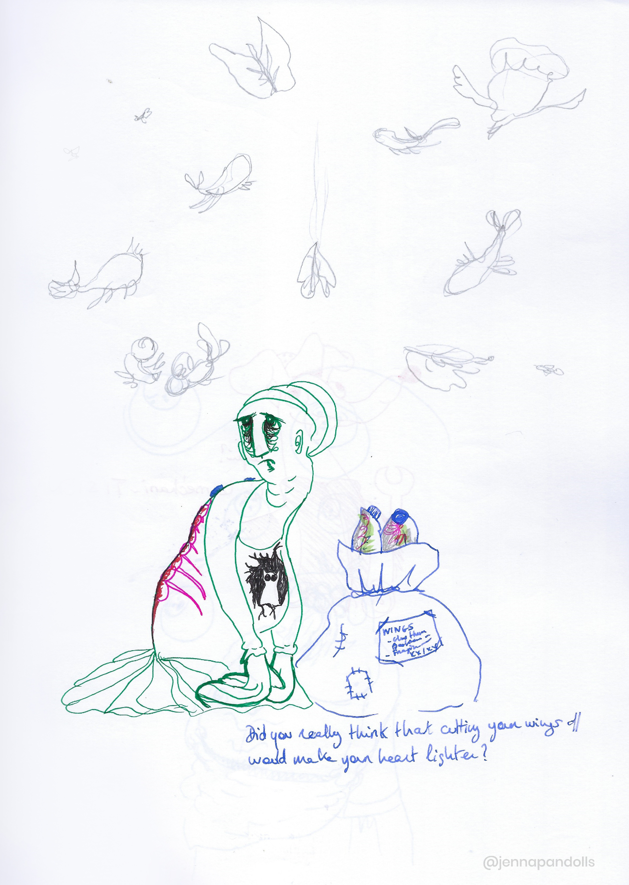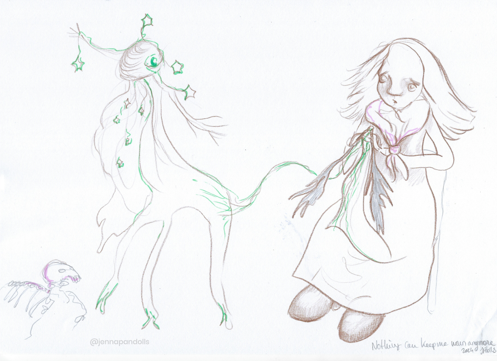 Day (website background), 2025Paper collage, stylized with felt tips, pencils and acrylics. Night (website background), 2025Paper collage, stylized with felt tips, pencils and acrylics. Countryside life, 2024Paper doll house with two flaps, two detached characters and several pieces of furniture. Drawn with pencils and coloured felt tips. I have a problem doctor, 2019Drawn by hand with black felt tips, and coloured-in with graphic design software. Chicken Boi, 2021Paper doll articulated with split pins. Painted with watercolours. About 20 cm. Louisa, 2021Paper doll articulated with split pins. Painted with watercolours. About 20 cm. Wanda, 2021Paper doll articulated with split pins. Painted with watercolours. About 20 cm. Sketches and Scenes, 202412 Images Felt tips and pencils. Nothing can keep me warm anymore, 2024What to do now?, 2024Inner struggle, 2024Severe, 2024Powerless, 2024Carrying waves, 2024Conversation, 2024When you're grounded, 2024Flower fairy, 2024Did you really think that?, 2024Through my eyes, 2024 Congratulations, you're an artist!, 2019Black felt tip and pencils. The Archer, 2022Drawn by hand with pencil, and coloured-in with graphic design software. The Artsy Clown, 2020Submitted to Poppen Atelier for her big 500k subscribers collab on her youtube channel. Under the Moon, 2025Paper collage, stylized with felt tips, pencils and acrylics. Under the Moon, 2025 Something there, 2025Paper collage, stylized with felt tips, pencils and acrylics. Sketches and Scenes, 2020-20216 images. Felt tips and watercolour. Regrets, 2020Scenes 1, 2020Esprits, 2021Quest, 2020Scènes 2, 2020 Business Cards2 images. Drawn by hand with black felt tips, and coloured-in with graphic design software. Business cards, 2019 Illustrations for catalogues and websites7 images. Drawn by hand with black felt tips, and coloured-in with graphic design software. Back cover of the catalogue Jenna Pan 2015-2020Ernest le Modeste, 2020Drawings from "Jenna Pan 2015-2020" catalogueTemporary website banner, 2025Website banner part 2, 2019Website banner part 1, 2019